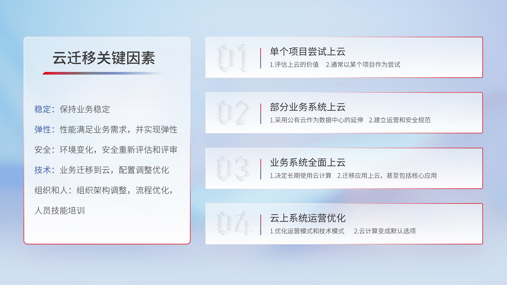 结合实际业务,,,从规划设计、、云平台选型、、、云原生改造、、、、数据迁移、、集成交付,,,迁移全过程为客户识别最佳上云路径,,,做好风险识别管理,,,,设计网络架构、、、身份权限、、、、安全审计合规、、、、操作审计、、、、日志审计、、监控告警策略、、、、多站点容灾设计等,,,对云上基础设施进行整体规划,,提升IT治理水平,,,,以满足弹性、、高可用、、、、高性能的需求。。