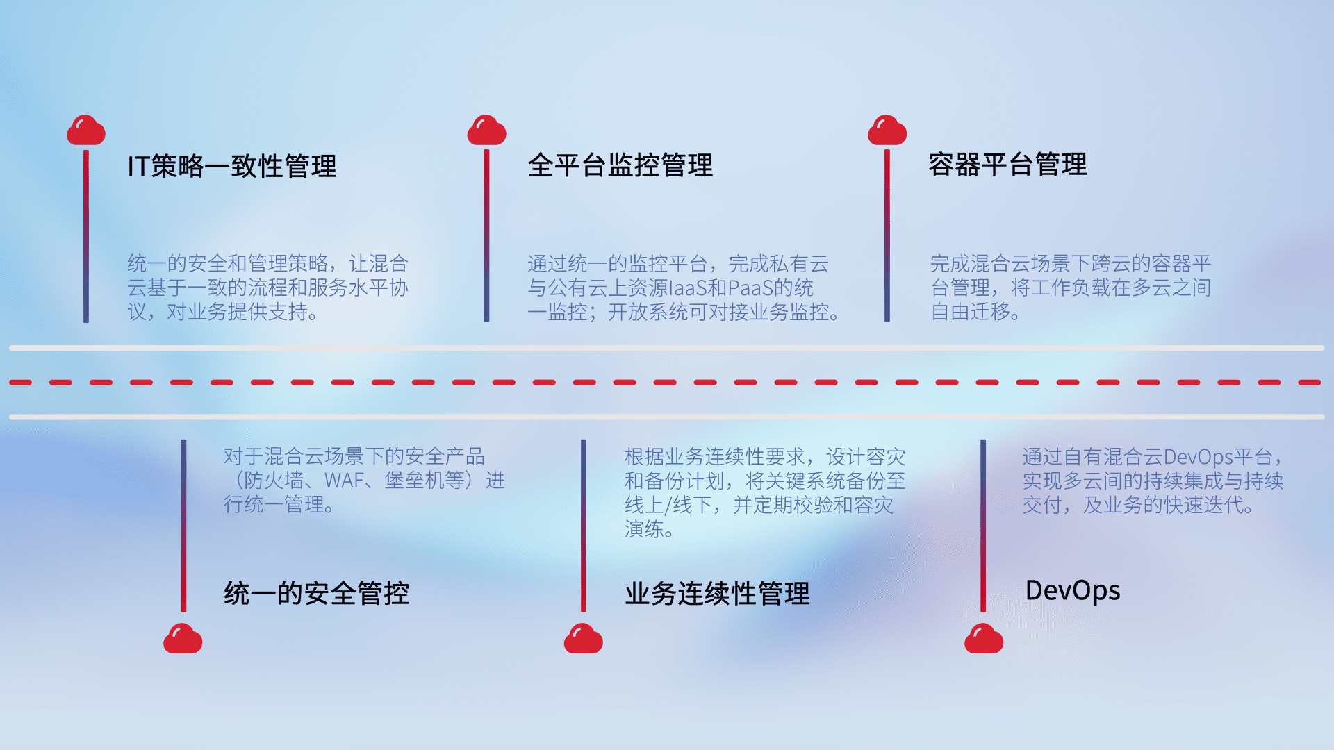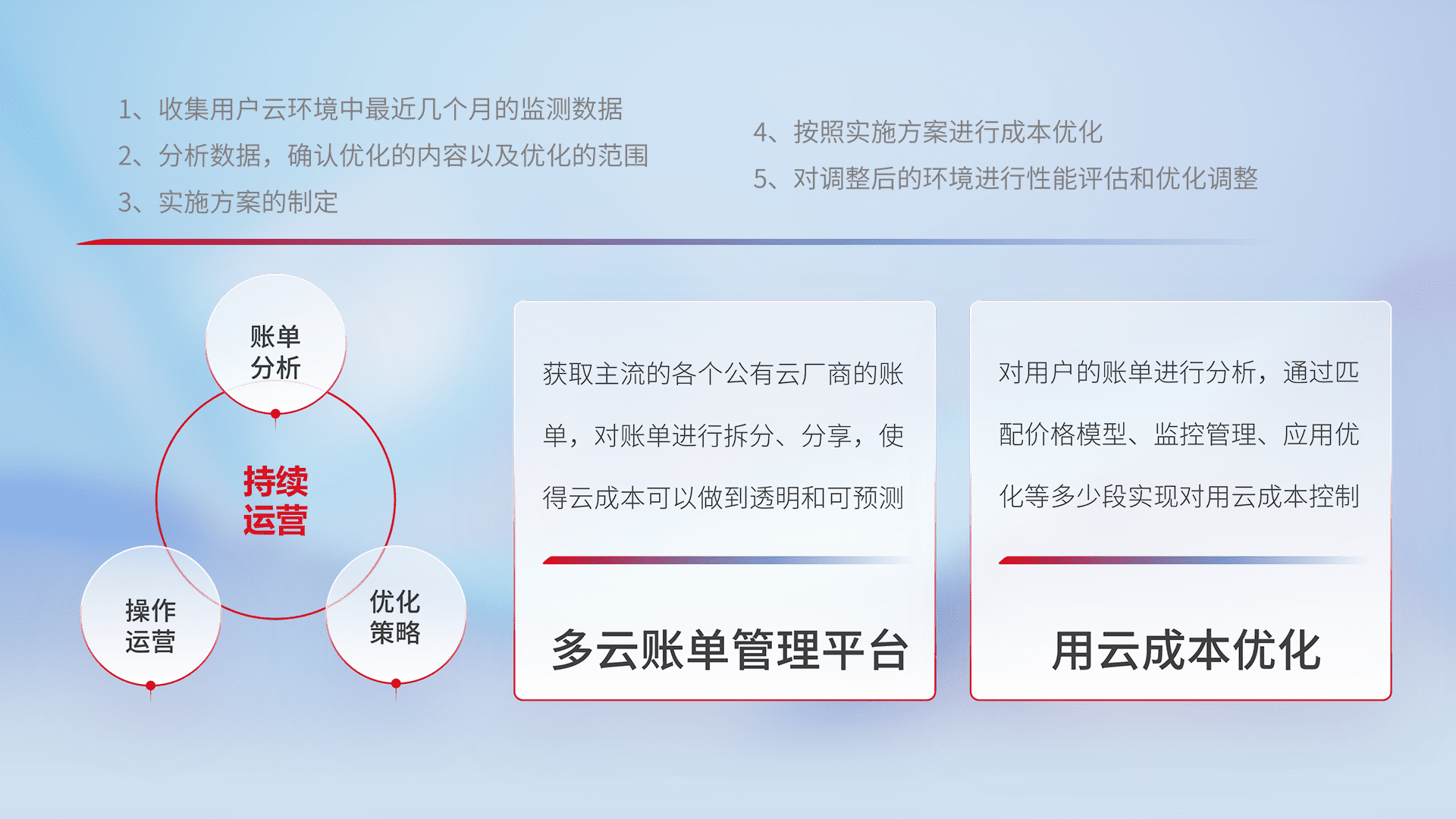 通过多云纳管,,,,以统一的资源数据模型把客户的云资源进行抽象和封装,,进而实现对多云资源的统一操作,,,,保障云资源管理的可靠性、、、稳定性与可用性。。。量身定制化运维内容,,,,配置、、、、开发运维、、补丁管理、、、、备份、、、、监控、、、、认证和访问管理、、审计和日常巡检等,,,保障在用云过程中的可靠度,,,稳定度以及高可用率。。。